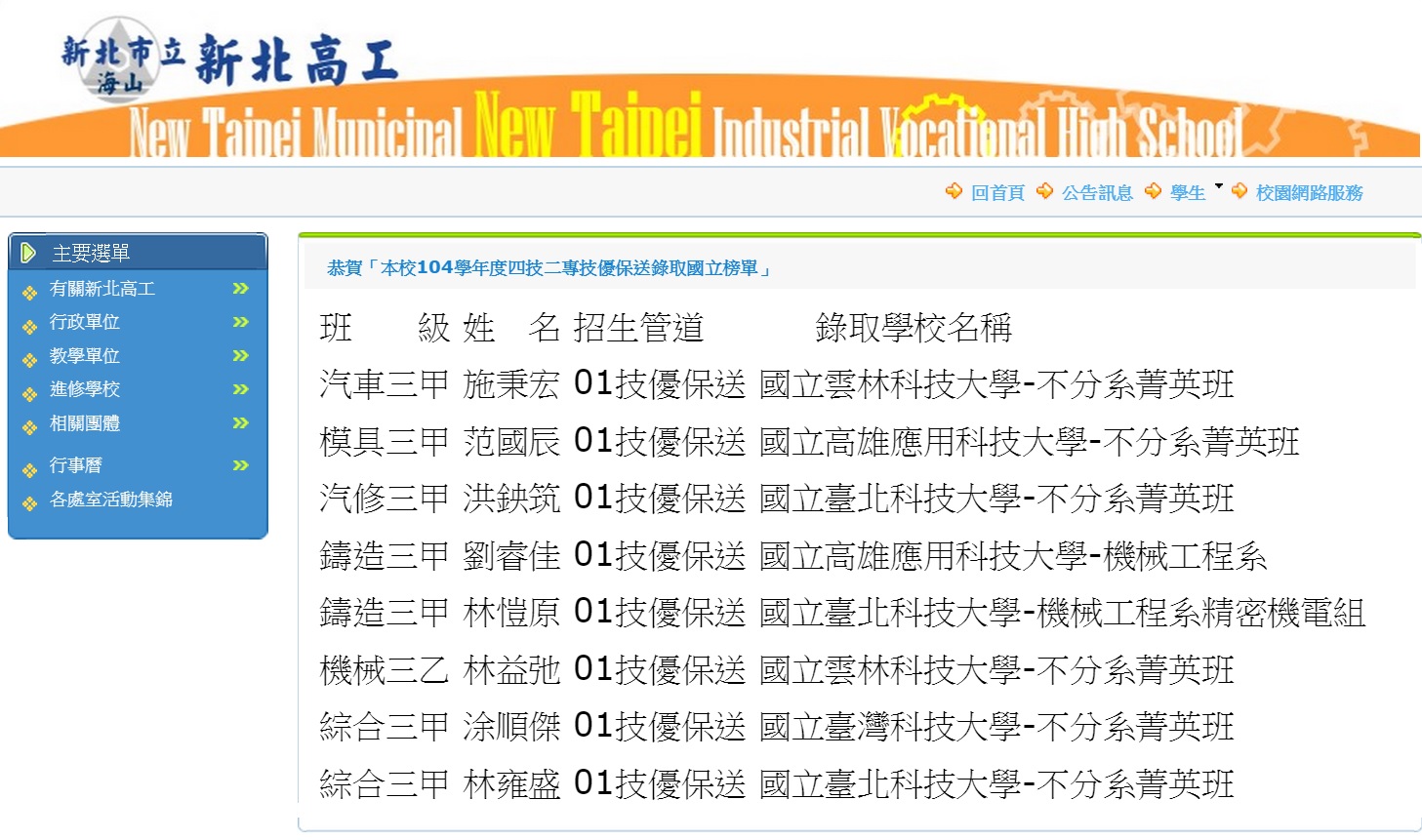 恭賀本校104學年度汽車科四技二專技優保送國立科大榜單