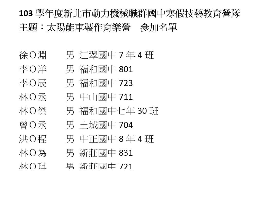 公佈103學年度新北市動力機械職群國中寒假技藝教育太陽能車製作營隊參加名單